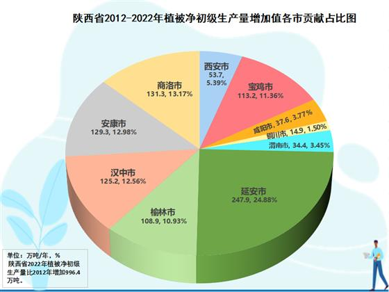 2012-2022年分市元生產量增長貢獻分析結果表明,各市對全省生態蛋糕增長均有所貢獻,但各市的貢獻大小差異很大,在生態蛋糕中的地位也隨之有所變化。全國退耕還林策源地美稱的延安是全省生態蛋糕增量最大的市,10年增加247.9萬噸,為全省生態蛋糕增加量貢獻了24.9個百分點。商洛第二,10年增加131.3萬噸,為全省貢獻13.2個百分點。安康第三,10年增加129.3萬噸,為全省貢獻13.0個百分點。漢中第四,增加125.2萬噸,為全省貢獻12.6個百分點。其后,依次分別是寶雞增加113.2萬噸、為全省貢獻11.4%,榆林增加108.9萬噸、為全省貢獻10.9%,西安增加53.7萬噸、為全省貢獻5.4%,咸陽增加37.6萬噸、為全省貢獻3.8%,渭南增加34.4萬噸、為全省貢獻3.4%,銅川增加24.9萬噸、為全省貢獻1.5%。