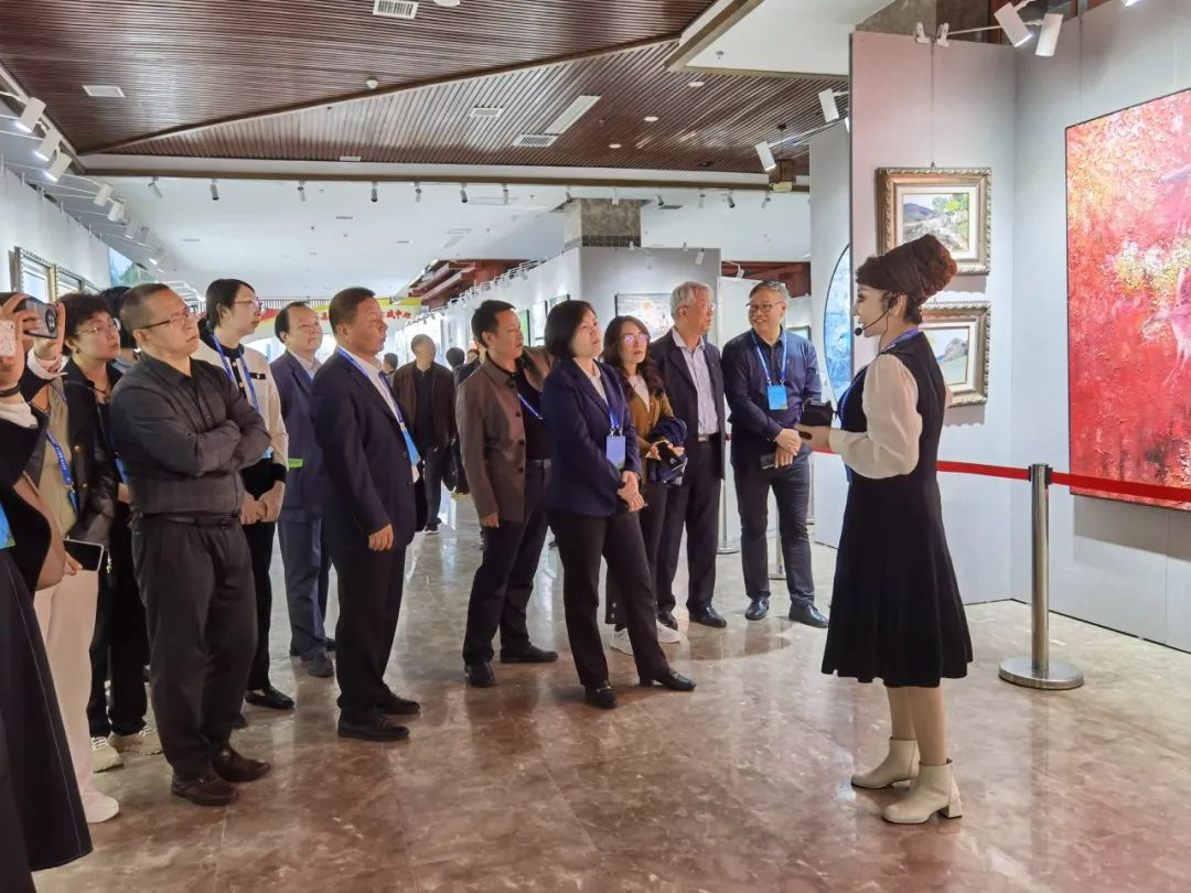 晏子油畫家向國家林業和草原局國際合作司劉昕司長(左二)、陜西省林業局鄭重局長(右二)講解油畫作品