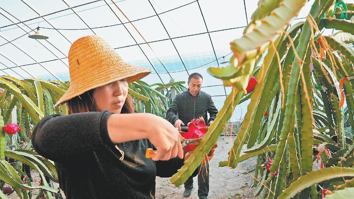 11月27日,時值初冬,記者在位于陜西省榆林市橫山區懷遠街道易地搬遷后續產業園內的火龍果采摘園看到,一株株類似仙人掌的植物攀援在水泥柱上,紅艷艷的火龍果掛滿了枝條,猶如一個個喜慶的小燈籠,工作人員正穿梭其間進行采摘,慕名而來的游客們則在體驗采摘的樂趣……