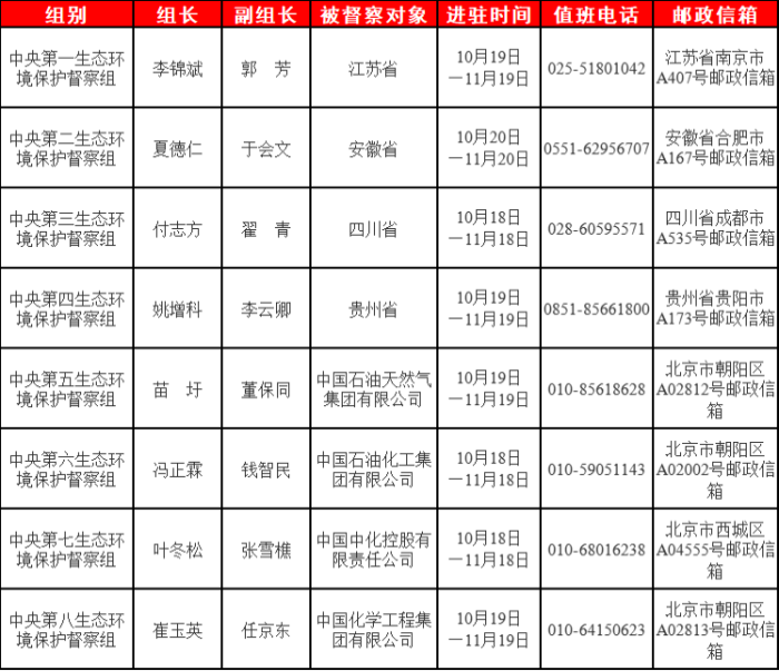 第三輪第三批中央生態環境保護督察進駐一覽表