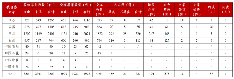 截至10月30日晚20:00,各督察組共收到群眾來電、來信舉報5865件,受理有效舉報4995件,經梳理合并重復舉報,累計向被督察對象轉辦4464件;被督察對象已辦結或階段辦結949件,其中立案處罰18家;立案偵查4件;約談黨政領導干部37人,問責黨政領導干部6人。