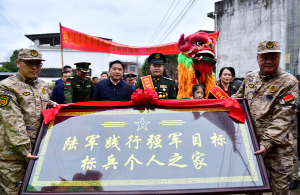 部隊建功勛、家鄉揚美名。2月2日,農歷大年初五,廣西桂林市陽朔縣委、縣人武部等部門,聯合為榮獲陸軍“踐行強軍目標標兵個人”榮譽稱號的現役軍人廖國金送立功喜報。