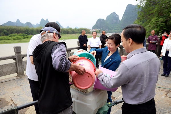 隨后,大家步行至水東門碼頭,開展了人工增殖放流活動。一尾尾活蹦亂跳的魚苗被放入漓江,為漓江生態注入新的活力。
