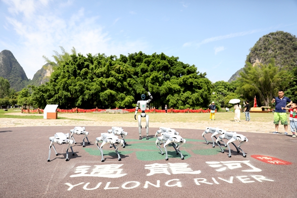 陽朔縣遇龍河景區新引入的智能機器人和四足機器狗亮相“五一假”期。陽朔縣遇龍河景區供圖