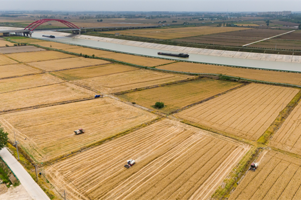 走進高店鎮高升村,在引江濟淮高店段河道邊,金黃的麥浪在微風中翻涌,與波光粼粼的河水相映成趣,收割機在運河兩岸的麥田里來回穿梭,豐收的景象盡收眼底。