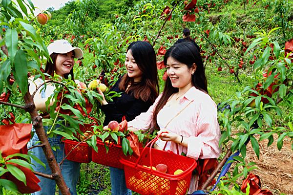 5月29日,走進新邵縣太芝廟鎮童家村童家生態農場的高山黃桃基地,映入眼簾的是一片片錯落有致的桃園景象。綠油油的桃樹上,裹著紅色牛皮紙“外衣”的桃子隨風搖曳,香氣四溢。一些未“穿衣”的桃子,則揚著紅通通的笑臉傲立枝頭,在陽光的照耀下閃爍著誘人的光澤。游客們手提果籃在桃林間穿梭,一邊精心挑選心儀的桃子,一邊迫不及待地品嘗著夏日里的第一口甜蜜。