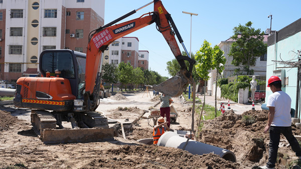 近日,在山東東營市勝坨鎮勝東小區的雨污分流改造工程項目施工現場,鏟車、挖掘機等車輛來回穿梭,十幾名工人正在緊張有序地進行施工,一片繁忙景象。