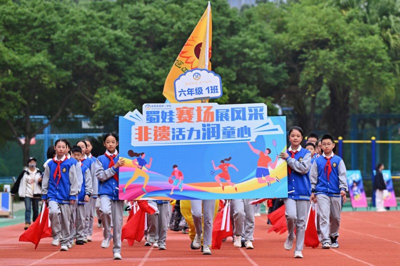 學校33個班級化身為四川各地的文化使者,將家鄉的非遺元素與運動創意巧妙結合。小學部以“蜀娃賽場展風采,非遺活力潤童心”為核心,各班級通過精彩的文化展示,將非遺元素與運動精神巧妙融合,讓傳統文化在賽場之上煥發新生,充分體現了學校對非遺傳承的重視;中學部則以“川韻少年,超越賽場”為主題,緊扣時代熱點,展現出新時代少年勇于突破、敢于超越的青春姿態,彰顯了川韻少年的獨特風采。
