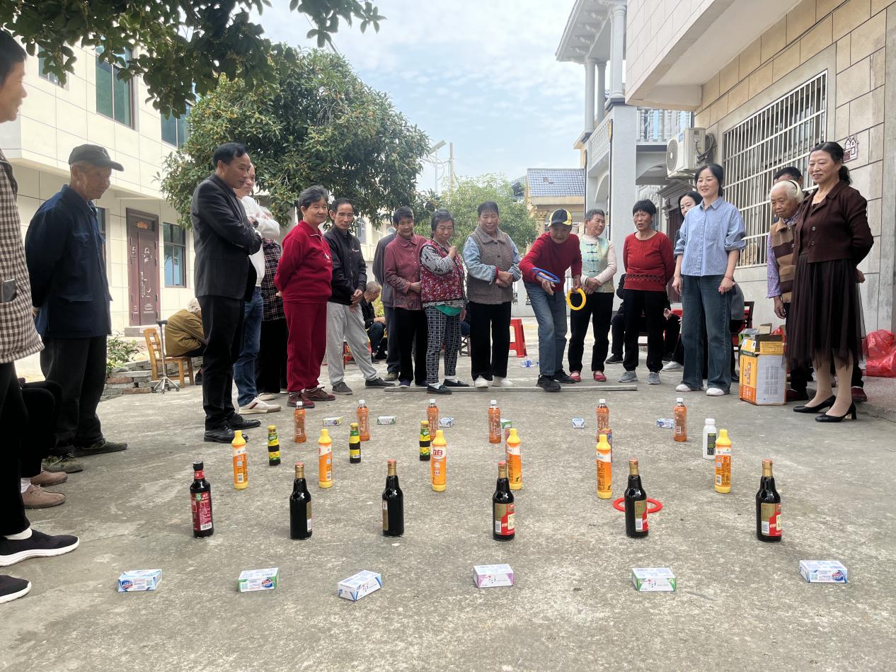 另一邊,紫荊村的趣味游戲區同樣熱鬧非凡?!班l村保齡球”環節,大家拿起籃球對準擺成陣列的礦泉水瓶,瞄準、投擲一氣呵成;“趕雞進籠”游戲里,老人們手持輕巧扇子,目光專注地盯著印有“土雞”圖案的氣球,輕輕發力將氣球“趕”向終點,動作間滿是童趣;“圈圈套?!庇螒蚋桥牌鹆碎L隊,老人們站在指定線外,瞄準心儀的醬油、肥皂、抽紙等日用品投擲套圈?!爸辛?!中了!”隨著一聲聲歡呼,成功套中心儀物品的老人臉上綻放出燦爛笑容,沒套中的老人也在大家的安慰下笑著繼續嘗試,歡樂與滿足的氛圍感染著在場每個人。